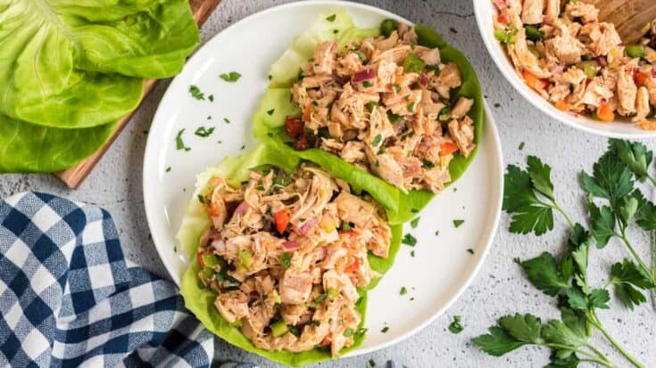 You can prep your chicken to make a salad in a crockpot or Instant Pot, buy a rotisserie chicken or pre-cooked-and-shredded package from the store, use leftover baked or grilled chicken, or make it budget-friendly with canned.