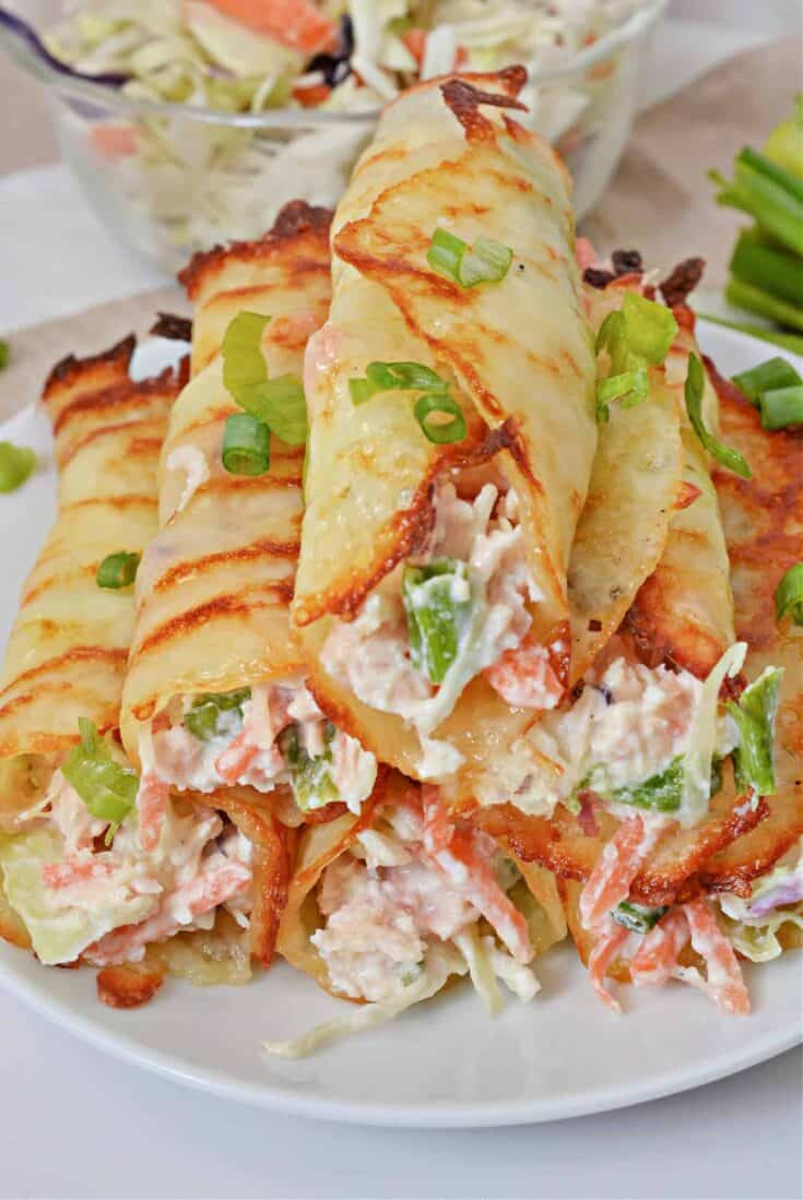 Two of your favorite recipes combined into one! These keto coleslaw chicken salad roll-ups are wrapped in a crispy cheese wrap that takes it to a tasty new level.