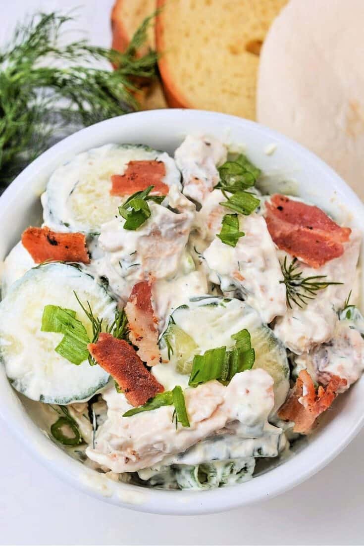 Zesty Sliced Cucumber Chicken Salad us filling, hearty, packed with protein, and filled with fiber-rich veggies. The dill sauce is the best part!
