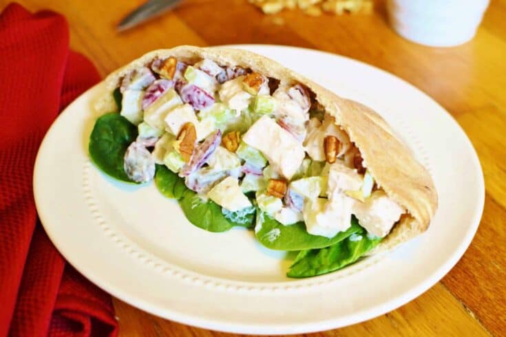 Waldorf Chicken Salad gets a healthy makeover with apples, greek yogurt, pecans and fruit. It tastes great inside a whole wheat pita pocket.