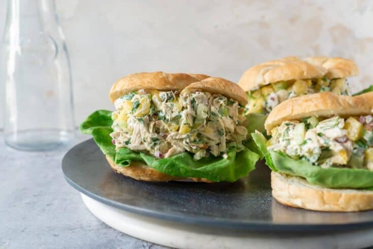 Pineapple Chicken Salad is so refreshing, combining bright and refreshing flavors like pineapple, cilantro, and dijon mustard. It's great by itself or with croissant sandwiches.