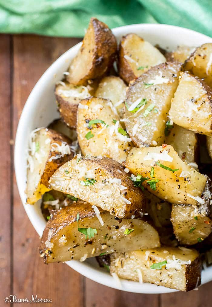 Crockpot Roasted Potatoes feature russet potatoes roasted in your slow cooker with garlic, Italian Seasoning herbs, including rosemary, and parmesan cheese for optimal deliciousness.