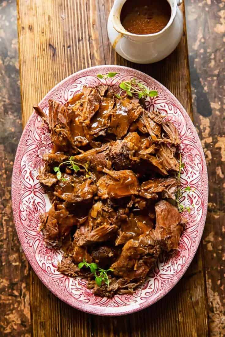 Super easy to toss together and taking only about 6 hours from start to finish and just minutes to prepare, French Onion Pulled Pork with Gravy tastes amazing with mashed potatoes and any of your favorite holiday sides.