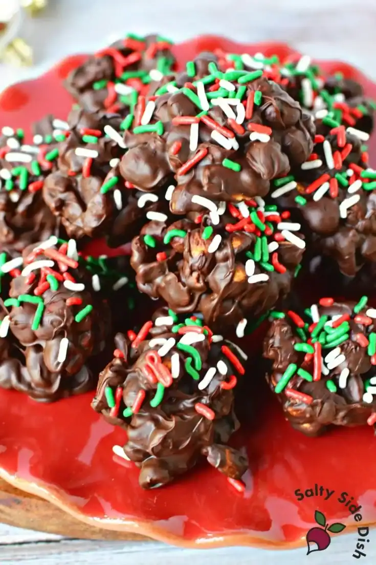 Chocolate peanut clusters feature rich, sweet chocolate melted over salty peanuts with the perfect accent of holiday sprinkles. Made in the crockpot, they’re a tasty edible gift with just a handful of ingredients.