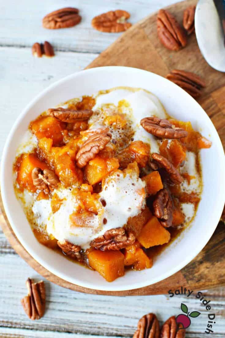 Crock Pot Sweet Potato casserole is a no-fuss, no-mess way to whip up this traditional holiday side dish. Delicious sweet potatoes get coated in brown sugar and topped with pecans and marshmallows.