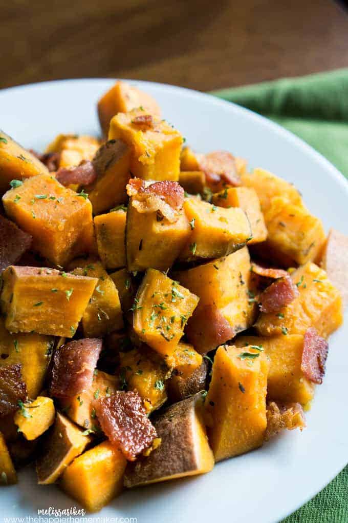 Slow Cooker Sweet Potatoes with Bacon is a hearty, savory side dish that takes just ten minutes of prep time and 3 hours in the Crock Pot. Such a simple way to cook sweet potatoes!