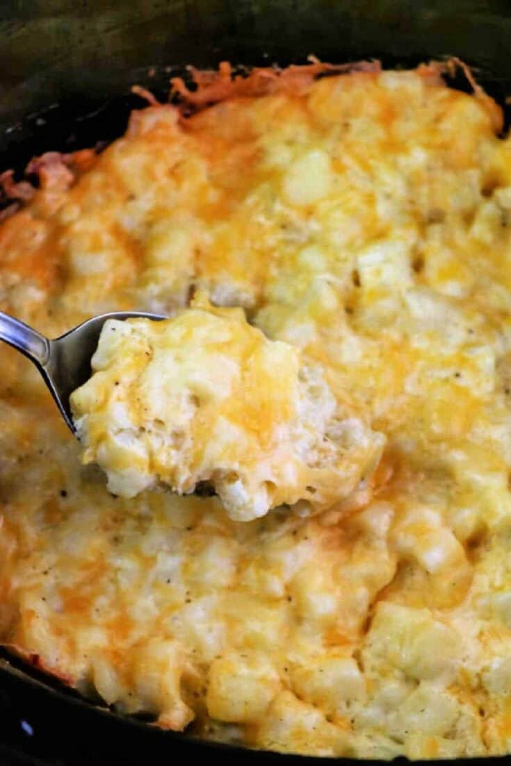 Crockpot Cheesy Hashbrown Potatoes are a great breakfast side dish or brunch item for Christmas, made super easy with defrosted or frozen shredded hash browns from the store.