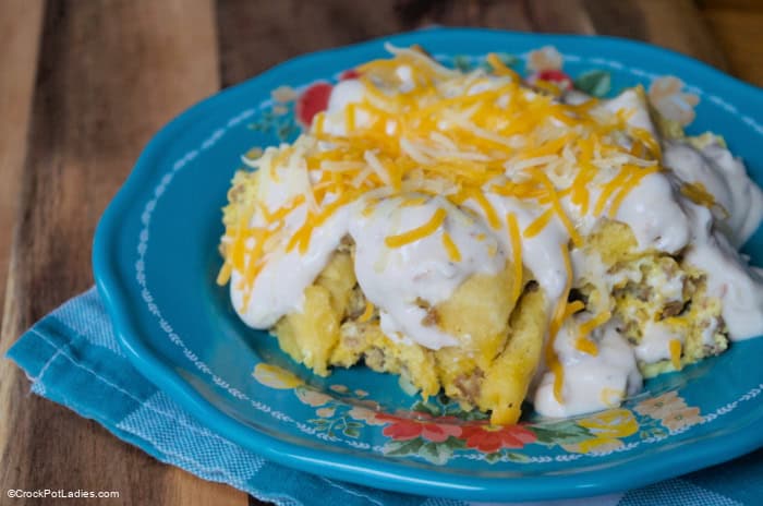 Crock-Pot Biscuits and Gravy Casserole is a yummy way to start your day off with a hearty breakfast filled with sausage, eggs, cheese & pepper gravy.