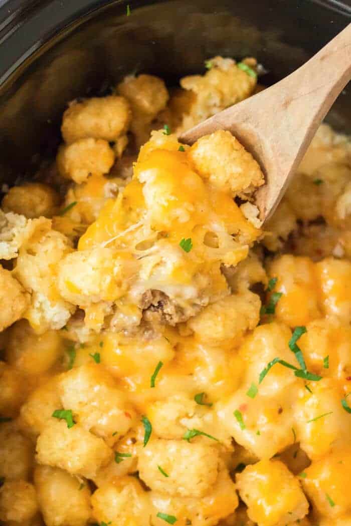 Crockpot Tater Tot Breakfast Casserole is made with sausage, eggs, cheese and topped with crispy tater tots to please even the pickiest eaters.