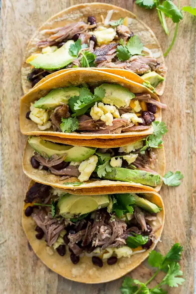 Slow Cooker Carnitas Breakfast Tacos are so easy with marinated pork, scrambled eggs, beans, cheese, sour cream, and salsa. Start pork the night before and wake up to ready to eat carnitas for a decadent, Mexican-style breakfast.