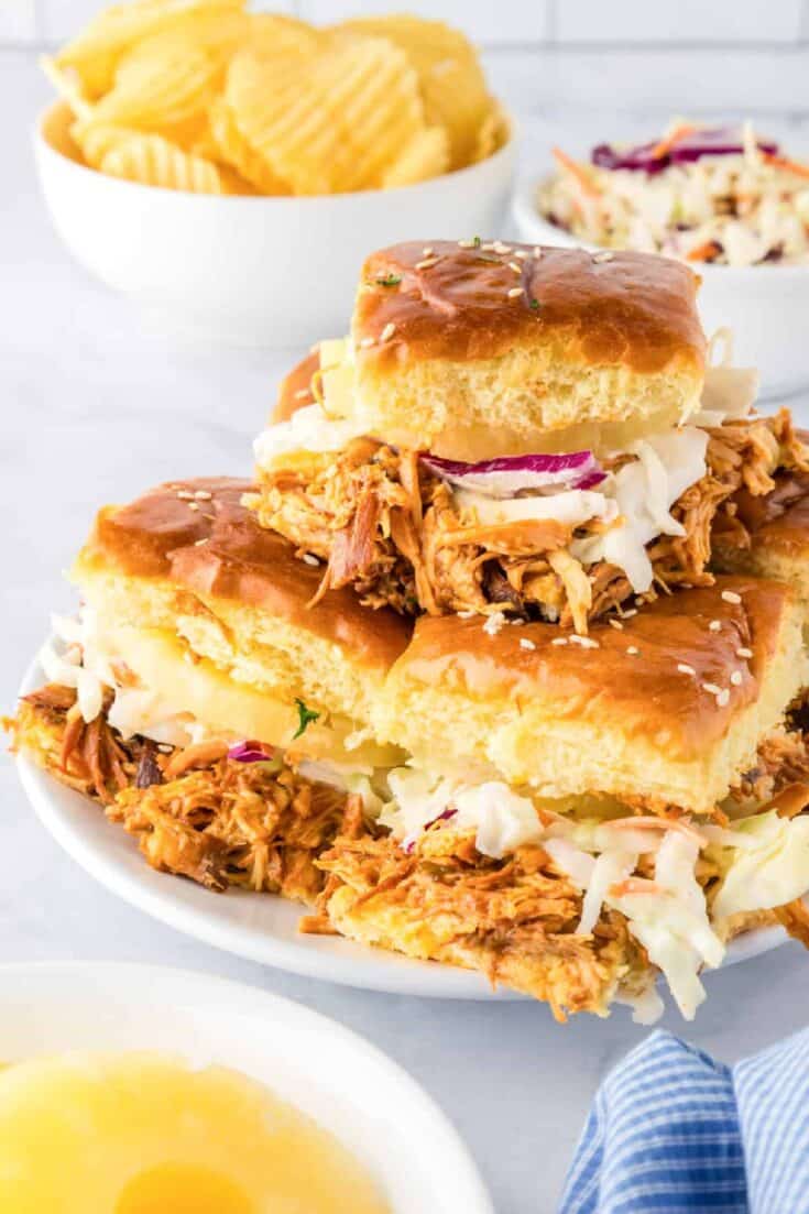 Slow cooker BBQ Hawaiian Roll Chicken Sliders are the ultimate delicious bite! The combination of sweet BBQ sauce mixed with pineapple on a sweet Hawaiian roll makes these sliders the perfect holiday party snack.