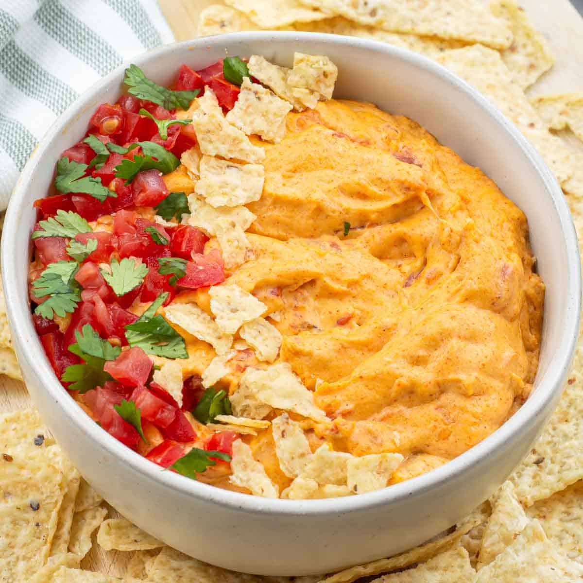 Cheeseburger Dip is the ultimate crowd-pleasing appetizer. It’s fully loaded with bacon and warm gooey cheese, and all your favorite burger toppings. It’s so good with either potato chips or tortilla chips.