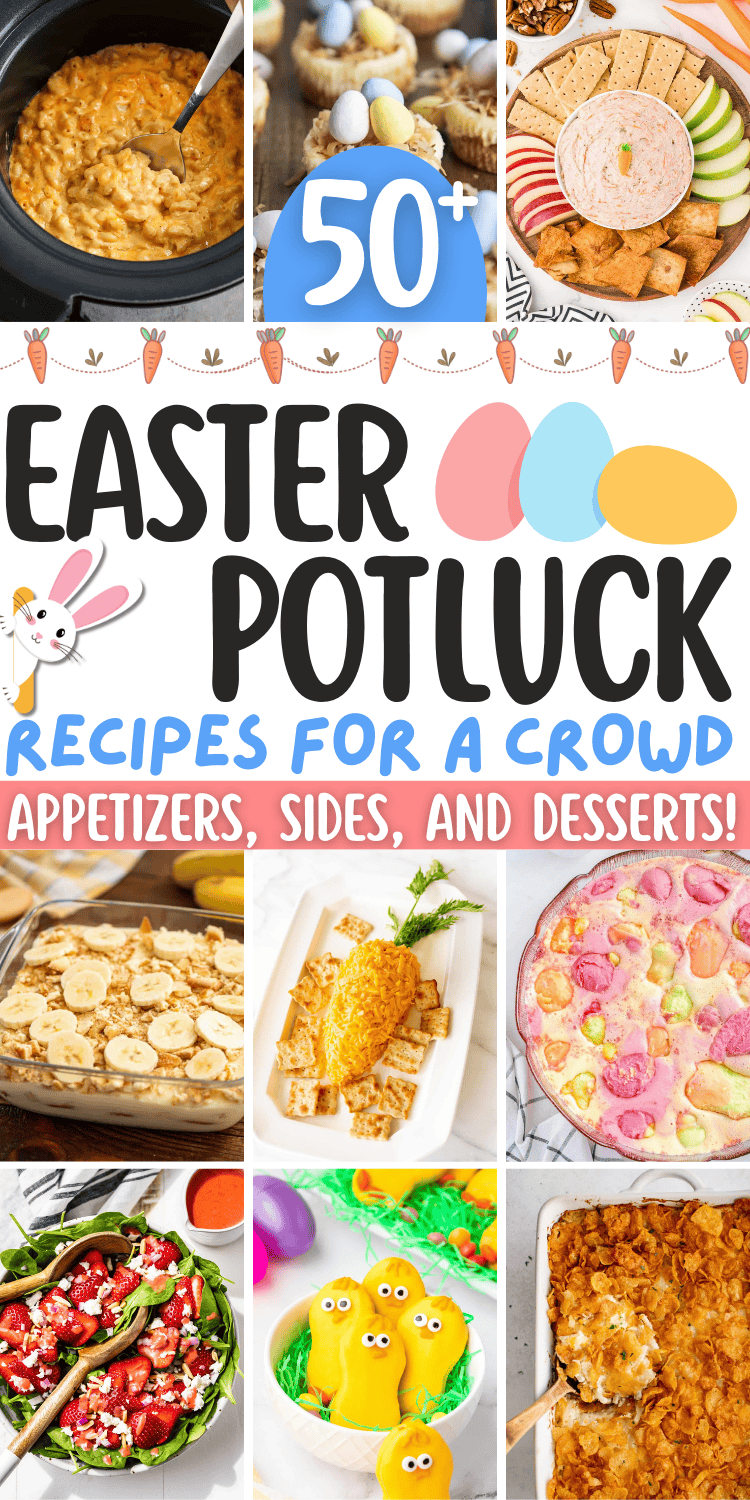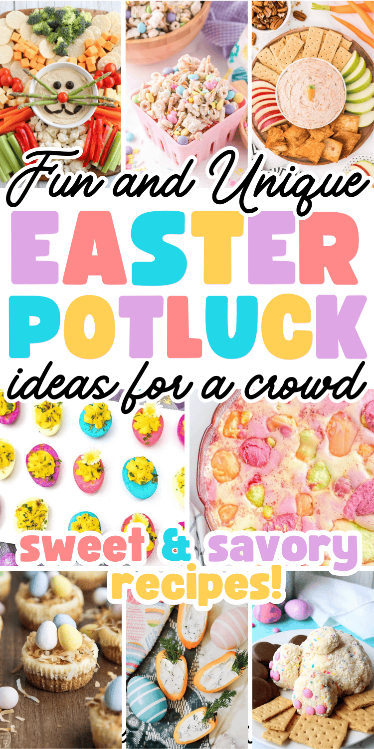 Easy Easter potluck ideas! These fun Easter party foods include side dishes, appetizers, desserts and sweet treats for a crowd.