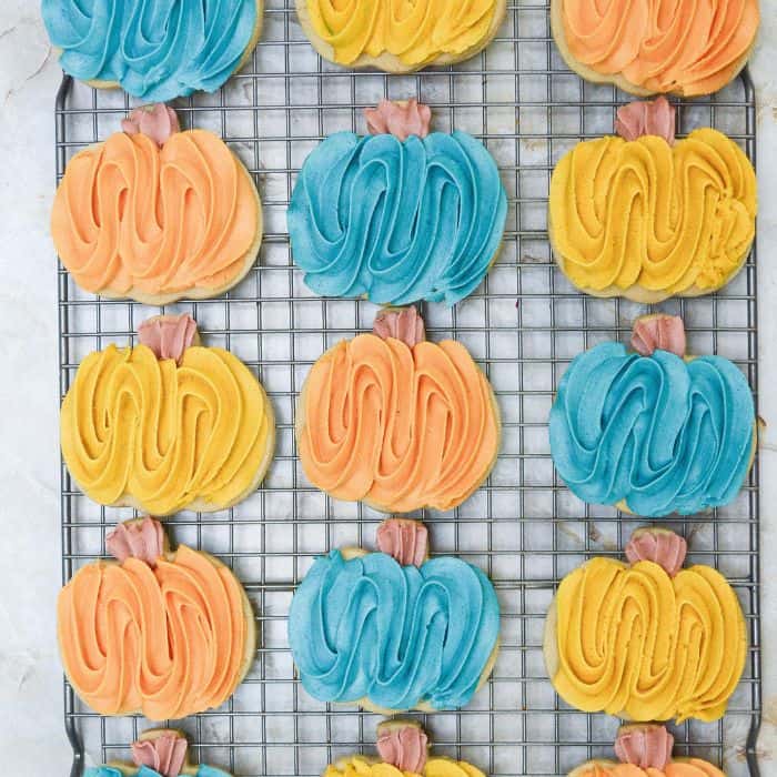 The assortment of frosting colors in these Pumpkin Spice Sugar Cookies make them extra gorgeous. They’re a delicious cookie-cut sugar cookie flavored with pumpkin spice seasoning for that special autumn flavor.