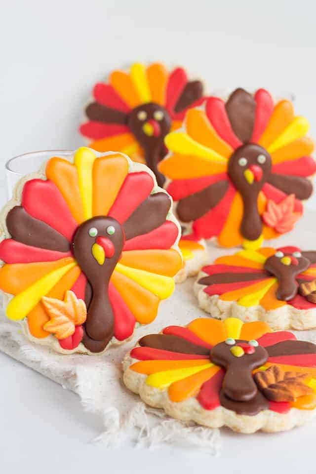 Turkey cookies are the cutest Thanksgiving dessert! Homemade cut out sugar cookies decorated with royal icing to look like Thanksgiving turkeys.