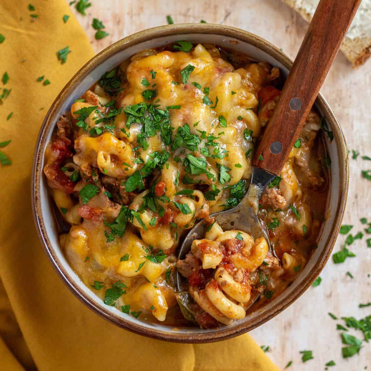 Made with lean ground beef or turkey, tender macaroni noodles, and diced tomatoes, Goulash a fun, kid-friendly dump and go dinner for busy weeknights.