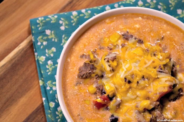 Tasty and frugal Crock-Pot Taco Soup is fun to serve with your favorite taco toppings like cheese, sour cream and tortilla chips