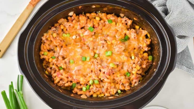 Slow Cooker Taco Mac and Cheese is a simple, family friendly dinner, with easy ingredients including ground beef and velveeta. Great for busy weeknights and picky eaters.