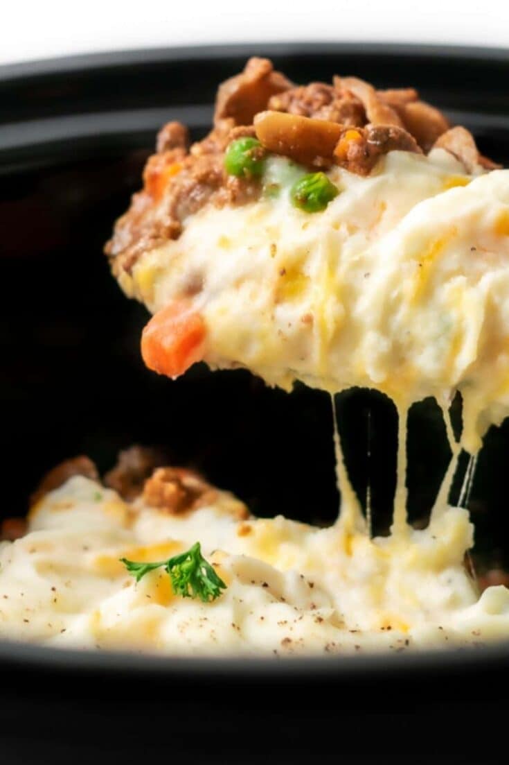 Crock Pot Shepherd’s Pie is an easy way to enjoy a classic comfort food casserole. Ground beef is slow-cooked with a tomato paste sauce, mushrooms, peas, and carrots topped with cheesy mashed potatoes.