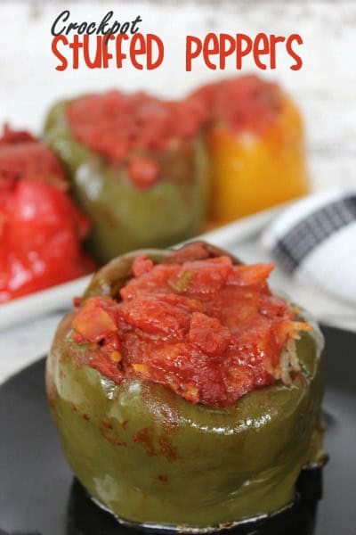 Crockpot Stuffed Peppers feature tender bell peppers stuffed with an ultra-flavorful beef and tomato filling. The slow cooker does all the work - you don't even have to boil rice or brown beef.