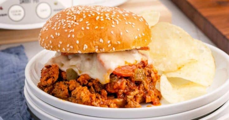 Combining two family favorites, Slow Cooker Pizza Sloppy Joes feature ground beef, and pasta sauce, cooked together with onions, peppers, and Italian seasonings, topped with pepperoni and mozzarella and served on a warm toasted bun.