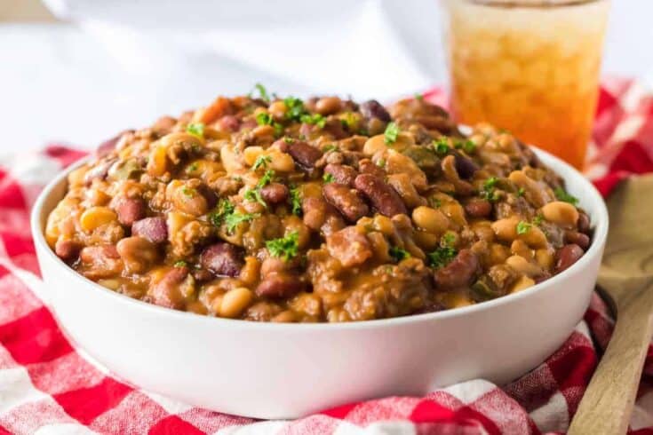 Hearty slow cooker cowboy beans with bacon and beef are the perfect side dish for your cookouts and barbecues, or filling enough as a main dish, too!