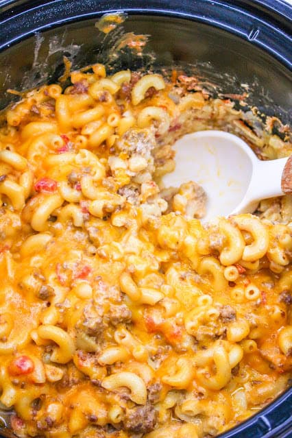 Crockpot Macaroni Casserole is an easy weeknight dinner made with ground beef, corn, pasta, onions, peppers, seasoned well, lots of melty cheese.