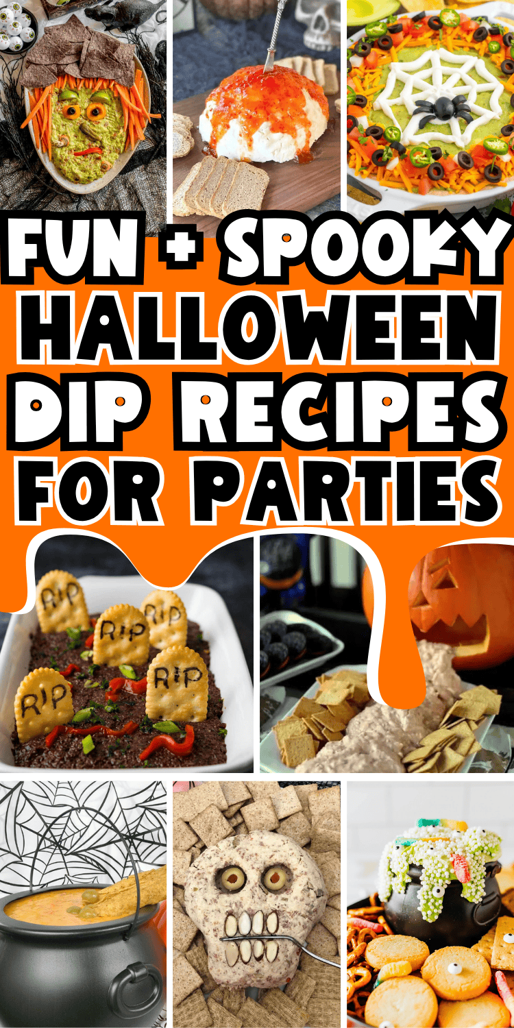 Easy Halloween dips for parties! Fun Halloween themed party dips including savory dip recipes and sweet dessert dips for both kids and adults.