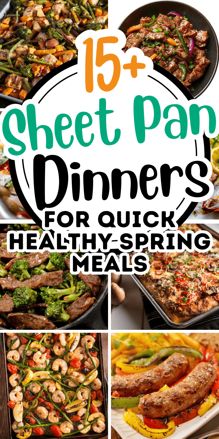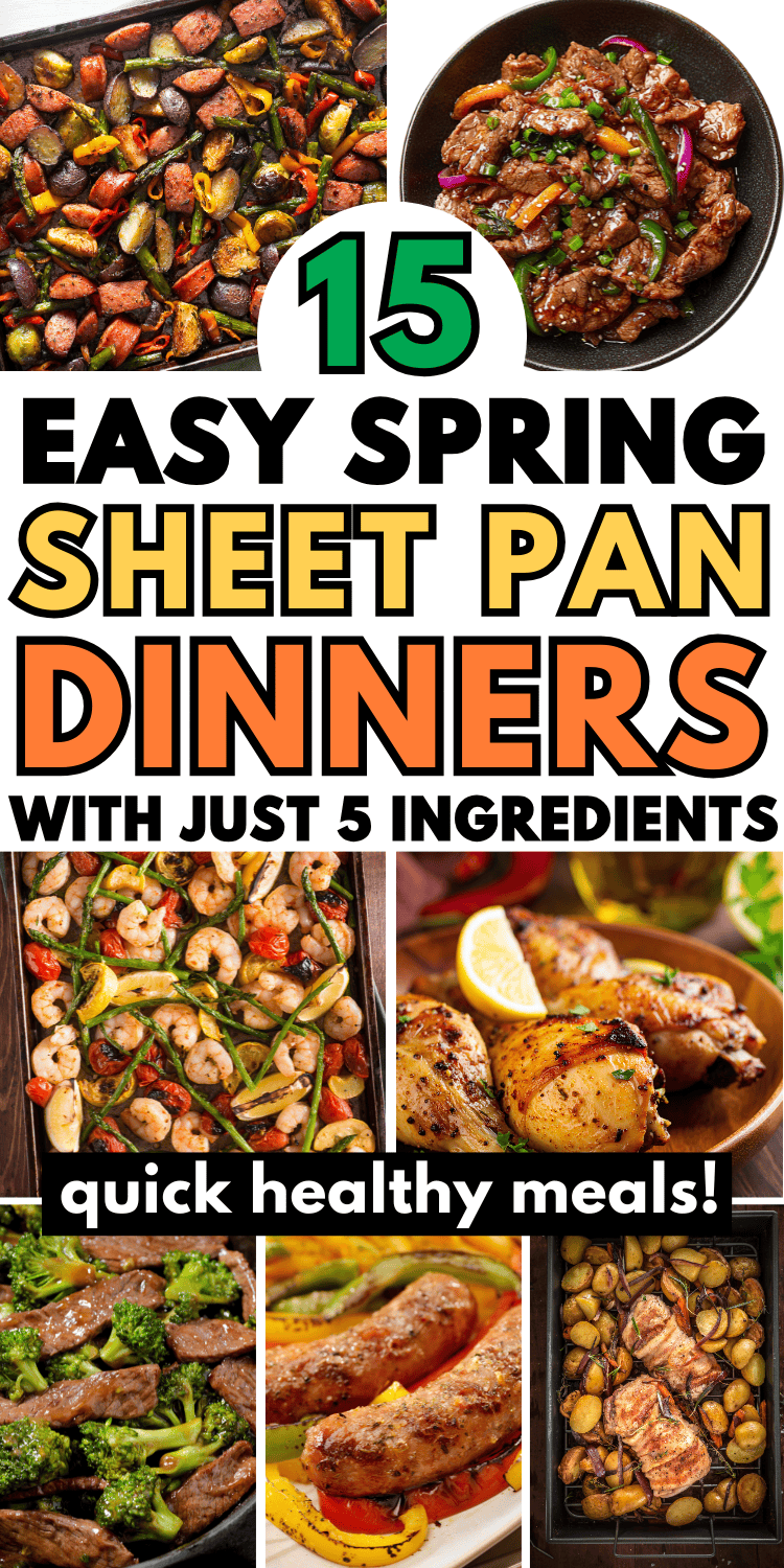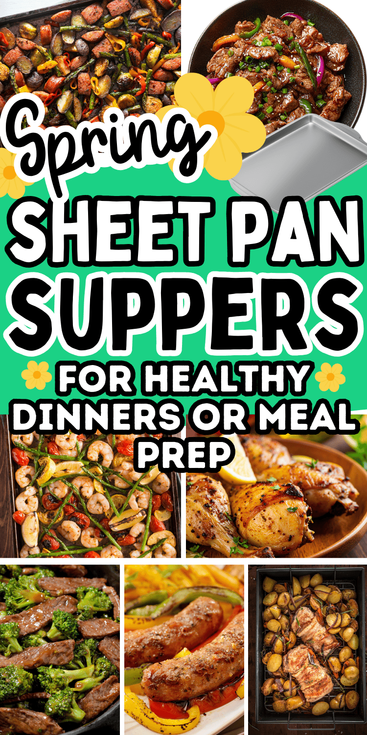 Easy Spring sheet pan meals! These healthy sheet pan dinners are simple, frugal meals and 5 ingredients or less recipes for budget friendly dinners or high protein meal prep.