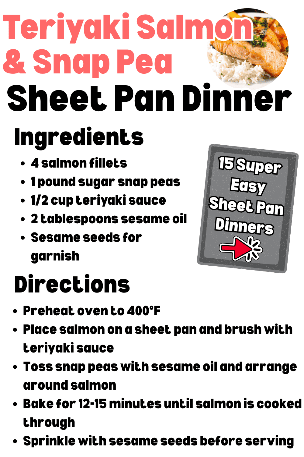 Sweet and savory teriyaki sauce perfectly glazes tender salmon fillets and crisp sugar snap peas roast alongside, maintaining their signature crunch.
